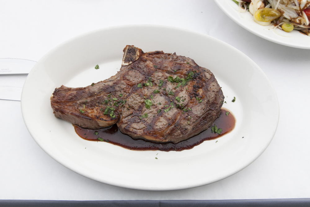 骨付きリブアイステーキ(約620g)は最高級の霜降り肉を使用。シンプルな味付けなので、女性でもおいしく食べられる。手間暇かけて仕込んでいるだけに肉は柔らかく、肉汁があふれるほどジューシーだ。