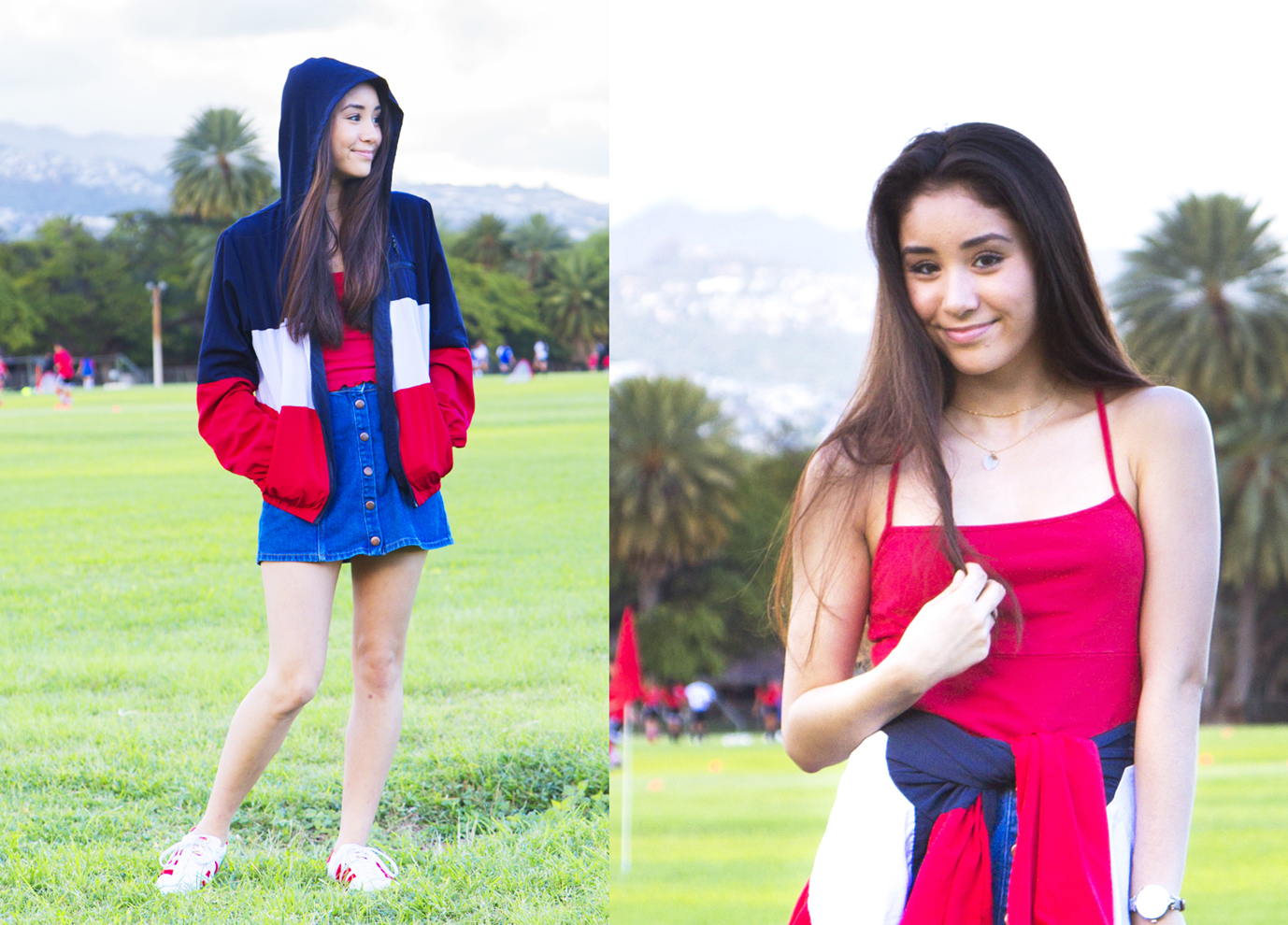 ジャケット: Brandy Melville カラフルなこのジャケットは、元気なキャラクターにも合っていてお気に入り! ハワイは天気が変わりやすいので、雨が降って肌寒くなったときにも大活躍!