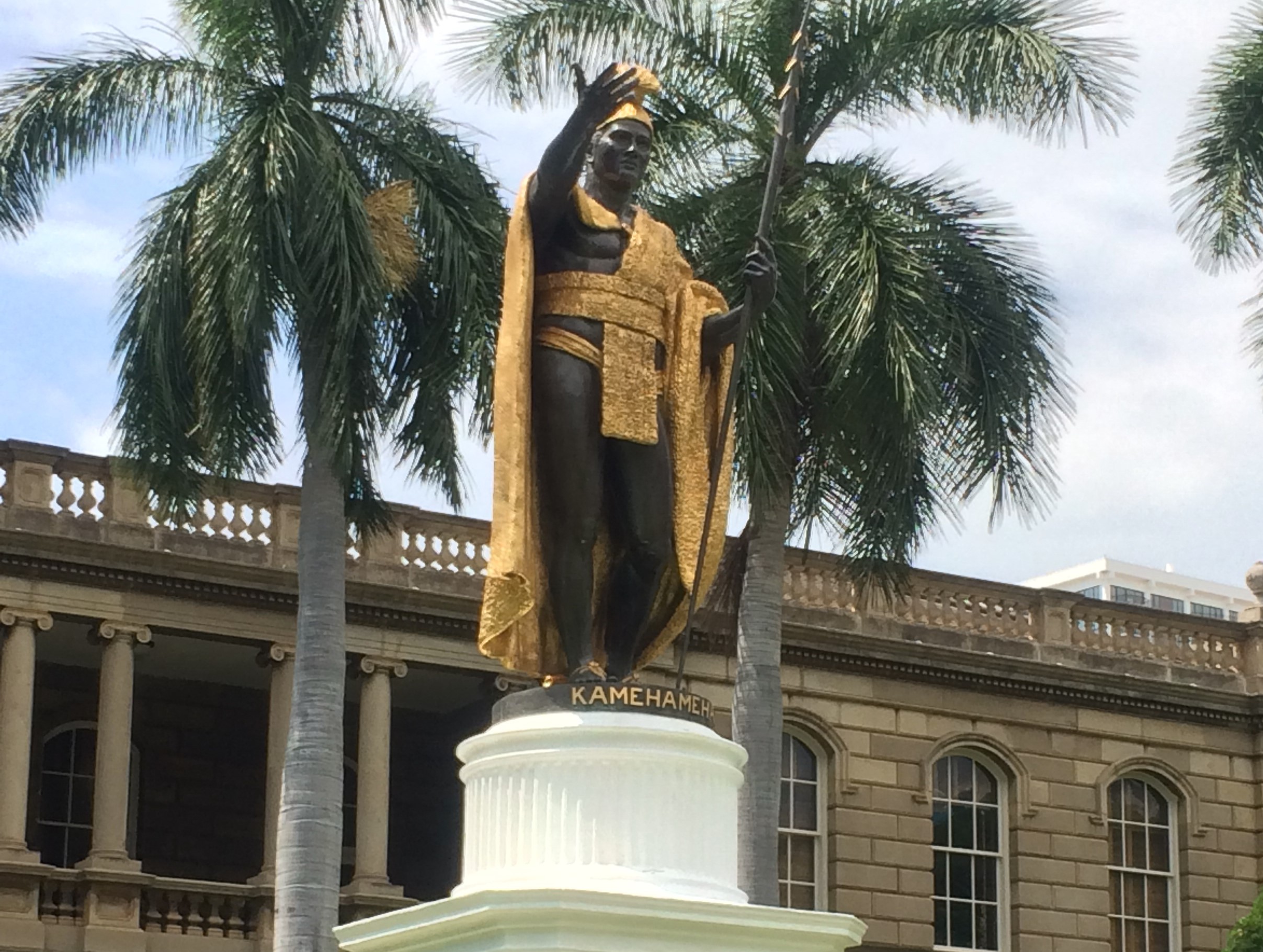 オアフ島ホノルルのハワイ州最高裁判所(アリイオラニ・ハレ)の前に立っている金色の像でもおなじみですね。