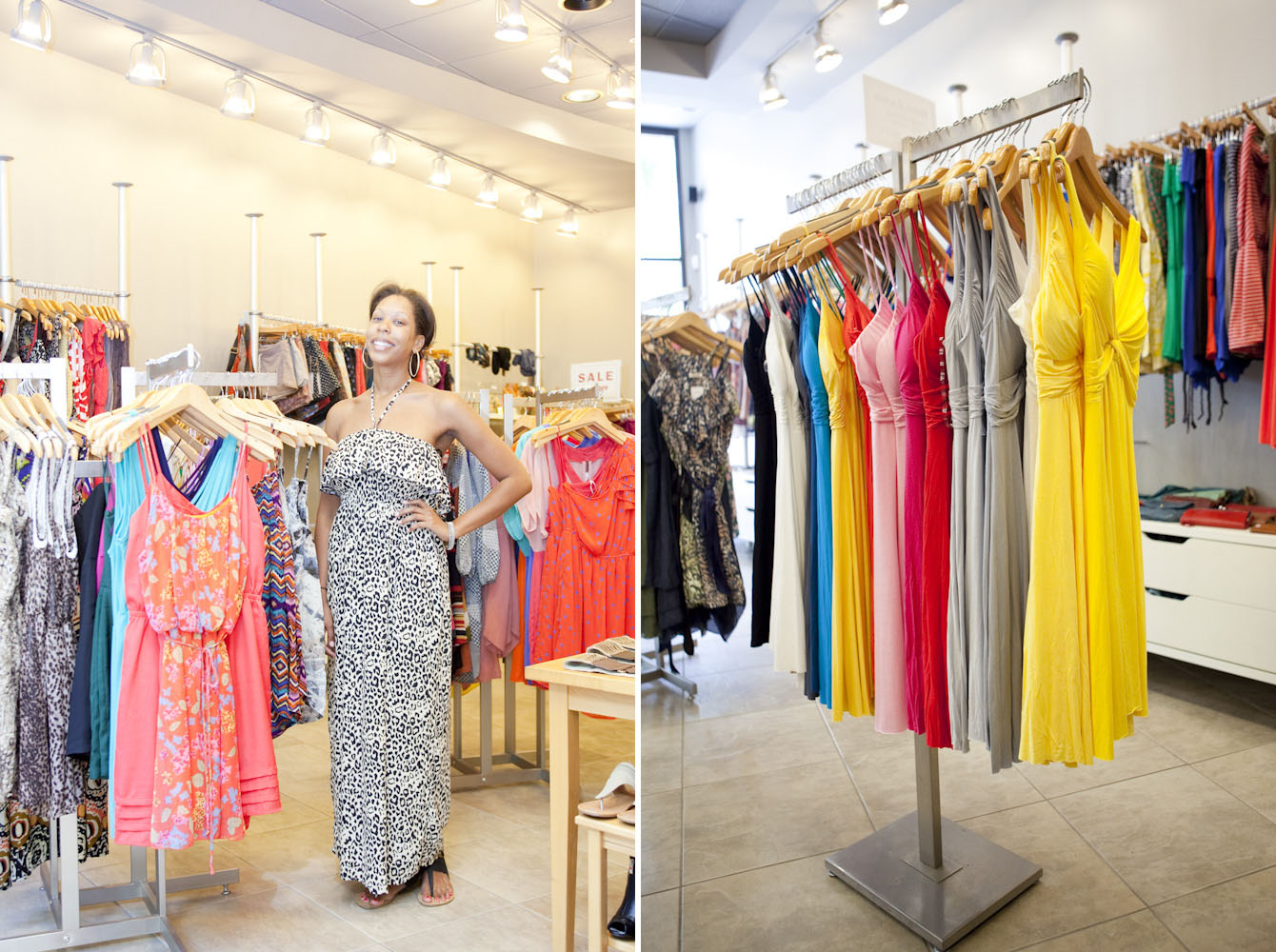 全面ガラス張りのショーウィンドウにはセンスよく着飾ったマネキンが並び、店内の様子もよく見える。白を基調としたシンプルながらたくさんのスポットライトで明るくライティングされた店内には、カラフルでカジュアルなワンピースやアクセサリー、ドレスコードがあるレストランにも着ていけるゴージャスなワンピースも多く揃う。