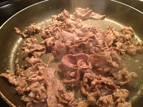 牛肉の薄切りを炒めます。 甘辛い味でもいいかなって思ったけど、