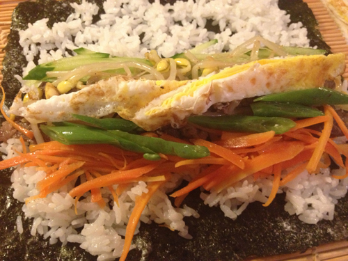 もやし、にんじんのナムル、きゅうりの千切り、 目玉焼きを巻きました。