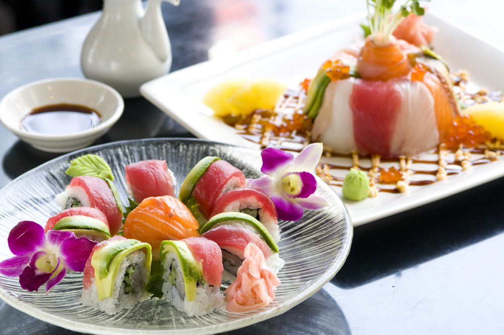 「レインボーロール」はハワイによく似合う「虹」をイメージ。マグロ・サーモン・ハマチ・エビ・イカ・ウナギがのっている。「ドラゴンロール」はウナギとアボガドといった日本ではなかなか味わえないコンビネーションが斬新。