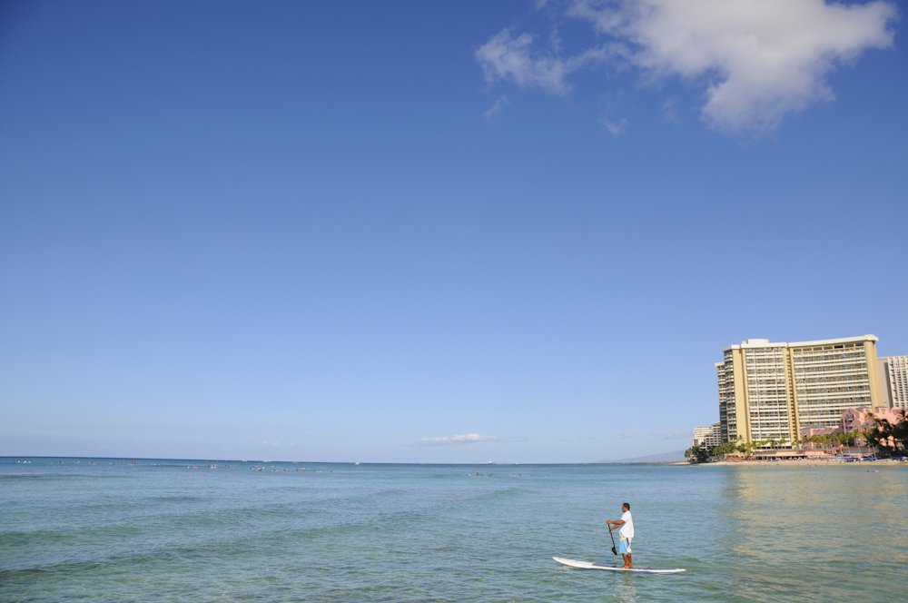 サーフィンデビューをするならワイキキがいいだろう。その理由は、その気軽さにある。ホテルで水着に着替え、必要なお金を持って徒歩数分のビーチに行けばOKだから。予約していなくても、簡単にボードが借りられる。日本、特に東京ではこんなにフットワーク軽くはとてもできないだろう。まるで散歩感覚でサーフィンができる環境なのだ。