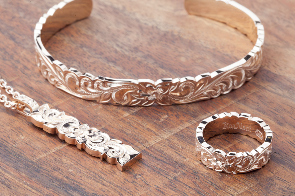 ハワイアンジュエリーは、ハワイ王朝最後の女王が亡くなった友のジュエリーの洗練されたデザインをベースに「ホオマナオマウ(永遠の思い出)」という言葉を掘り込んだゴールドのブレスレットを肌身離さずつけるようになったことに始まる。それ以来花や木々、波や海亀などハワイの美しい自然が彫り模様の特徴となっているハワイアンジュエリーは、親から子へ、子から孫へと受け継がれていくことも珍しくない。