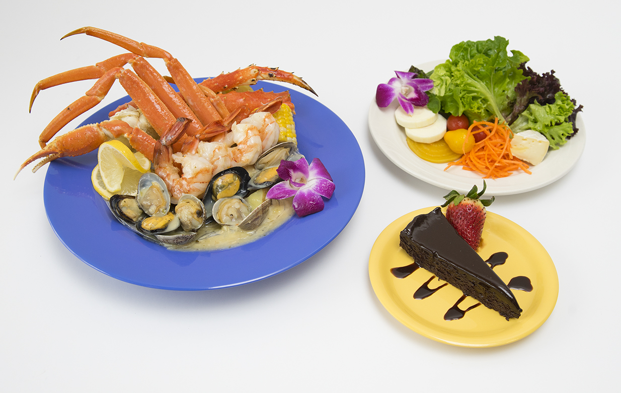 デラックスメニューのメイン料理は、骨つきフィレミニヨンのデミグラソースを添え。クリーミーなマッシュポテトやズッキーニやパプリカと一緒に。フキラウメニューでは、タラバ蟹、ズワイ蟹、エビ、ムール貝、アサリやイカをガーリックやバターと一緒に蒸し煮にして、リッチな魚介ブイヤベース仕立てのお料理がメイン。