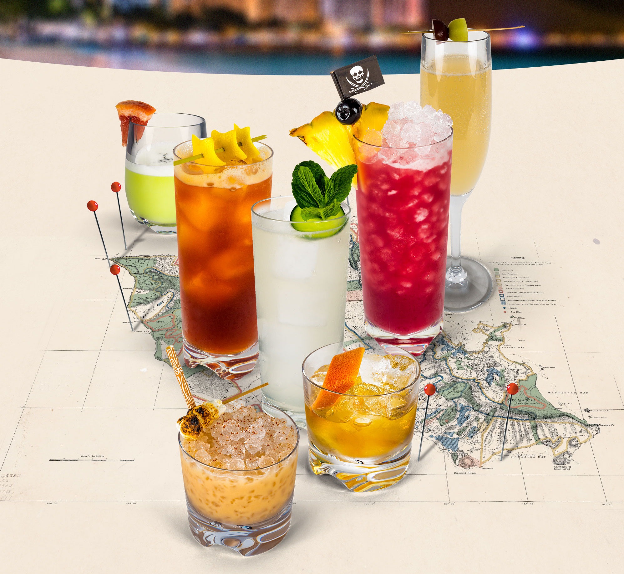 スカイワイキキのメニューには、オアフ島の地図とカクテルにちなんだサーフスポットの場所が記載されている。