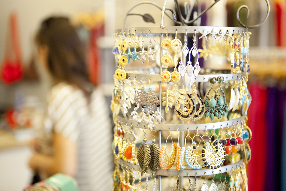 全面ガラス張りのショーウィンドウにはセンスよく着飾ったマネキンが並び、店内の様子もよく見える。白を基調としたシンプルながらたくさんのスポットライトで明るくライティングされた店内には、カラフルでカジュアルなワンピースやアクセサリー、ドレスコードがあるレストランにも着ていけるゴージャスなワンピースも多く揃う。