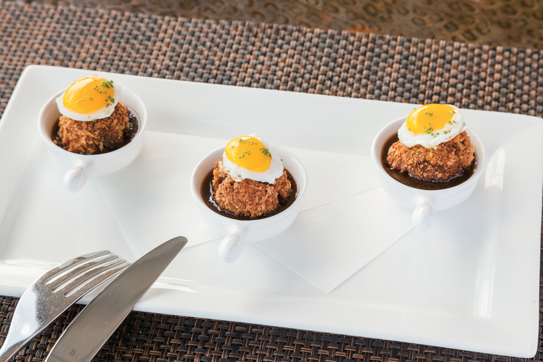 ハワイで最も小さなロコモコ「ワイオル・ロコモコ」(15ドル)は、一口サイズのライスコロッケにうずらの卵の目玉焼きをのせた独創的なスタイル。
