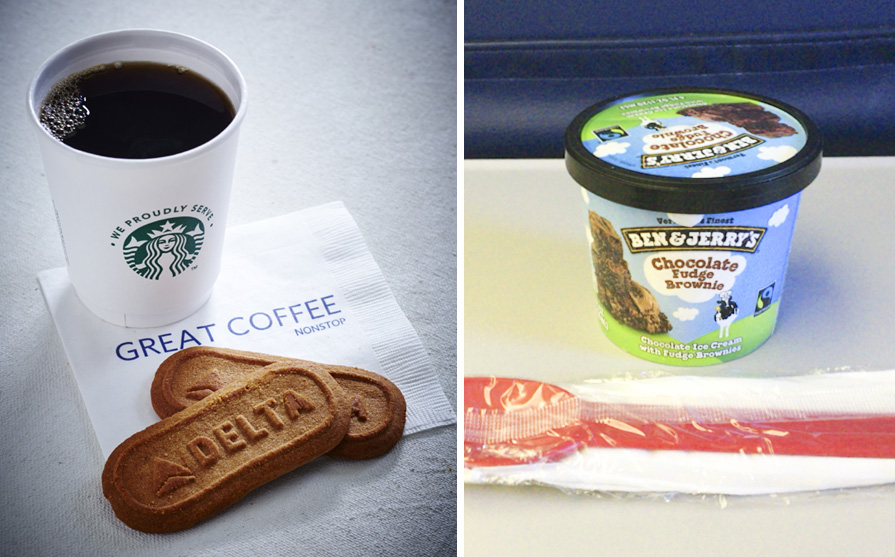 デルタ航空の機内は、食後に薫り高いコーヒーのアロマで満たされる。すべてのフライト、すべてのクラスでスターバックスコーヒーが用意されているのだ。カフェイン抜きを希望する人向けに、デカフェの選択肢もあるのが嬉しい。高度30,000フィートの上空で本格的なコーヒーを味わうのは、至福のひと時。
