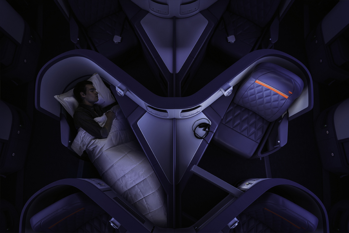 「デルタ・ワン」のシートは180度のフルフラットベッドになる上すべての座席が通路から直接出入りでき、プライベートな空間を確保できるのが特徴。1-2-1のゆったりとした配列で、中央の座席は会話もできる造りなのでカップルにもおすすめだ。